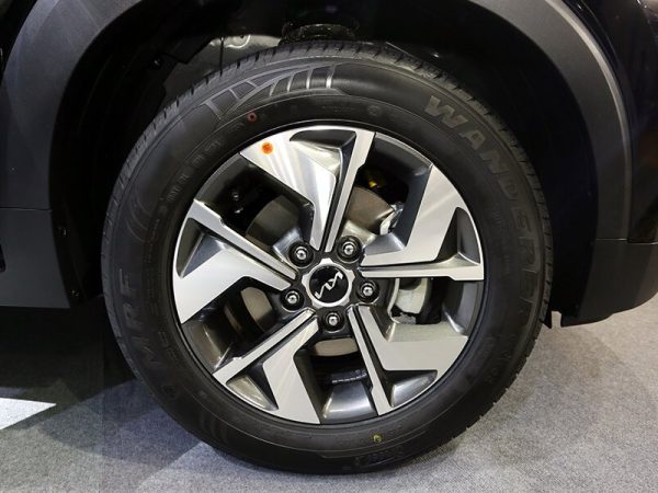 Tiến tới phần thân xe KIA Sonet nổi bật với những đường nét thiết kế đậm chất SUV với hốc bánh cao, ốp nhựa đen cứng cáp cùng những đường gân nổi. Xe sử dụng la-zăng 16 inch dạng 5 chấu, kết hợp 2 màu bóng, mang đến cái nhìn thể thao.
